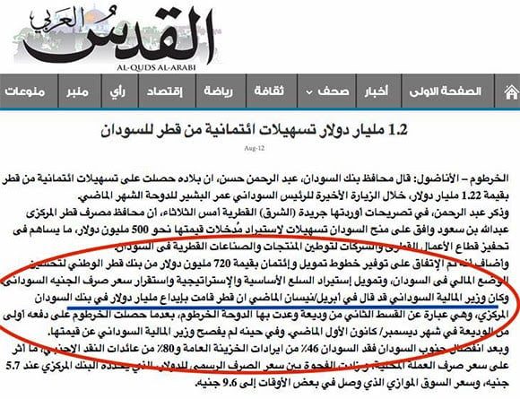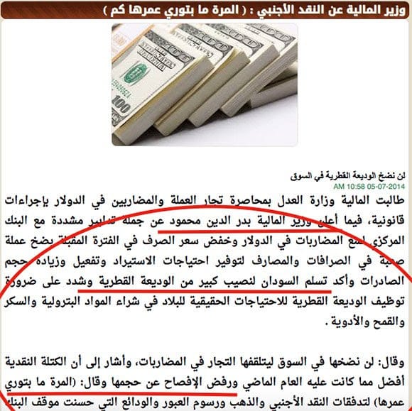 يوم 7 مايو 2014 نقلت الراكوبة عن الجريدة احجام ما نصه (وأكد تسلم السودان لنصيب كبير من الوديعة القطرية وشدد على ضرورة توظيف الوديعة القطرية للاحتياجات الحقيقية للبلاد في شراء المواد البترولية والسكر والقمح والأدوية.