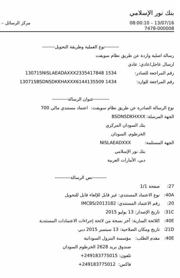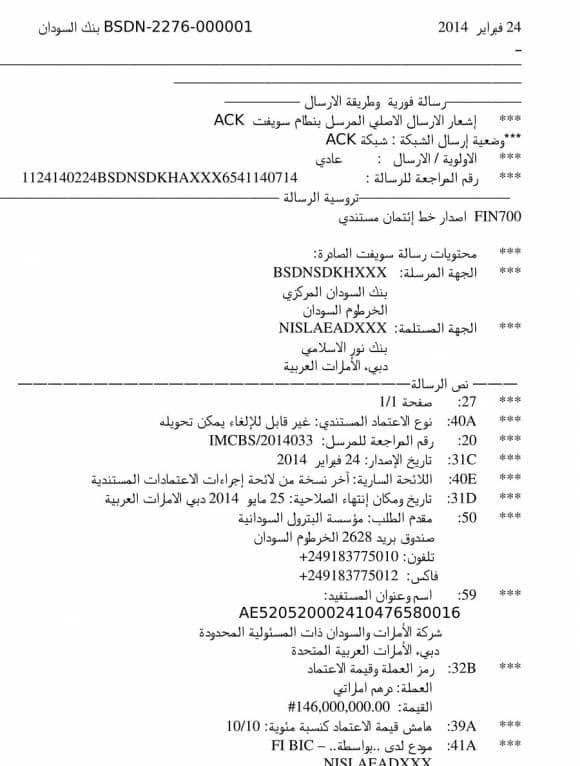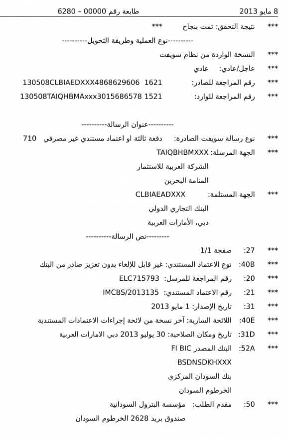 إستغل لصوصنا هذه الظروف فإزدادوا ثراءا وسحقوا عظام شعبنا. فعملية السمسرة وشراء مشتقات البترول أصبحت تخصص أل عمر البشير، ويمثل الأسرة شقيقه عبدالله حسن البشير، والفريق طه وبدرالدين محمود عباس ( في9 ديسمبر 2013 قفز من نائب محافظ لبنك السودان لثمانية سنوات ليصبح وزيرا للمالية) فقد إشتروا نفطا مسروقا بلا أوراق ثبوتية توضح بياناته واصله وفصله، قل نفط “ إبن حرام “! ولأنه كذلك، فقد حصلوا عليه رخيصا وبسعر يقل كثيرا عن مستوي الأسعار السائدة في البورصات والاسواق. عندما دفعوا قيمته كان التمويل بفلوس إقترضتها جمهورية اللصوص بإسمنا وهو قرض من نوع التركات التي سيثقلون بها كاهل الأجيال القادمة وستضاف لمديويونيتنا الخارجية! الرجاء ملاحظة أن ثلاثة من حوالات نظام سويفت الاربعة المعروضة في هذا التقرير حصلنا عليها وعبدالرحمن حسن، وله من لقبه نصيب وافر، في وظيفته الحالية، محافظا لبنك السودان. فقد وصل لهذه الوظيفة ليخلف إبن دفعته بدرالدين في 15 ديسمبر 2013 بعد 7 سنوات مديرا لبنك أمدرمان الوطني المنهار.