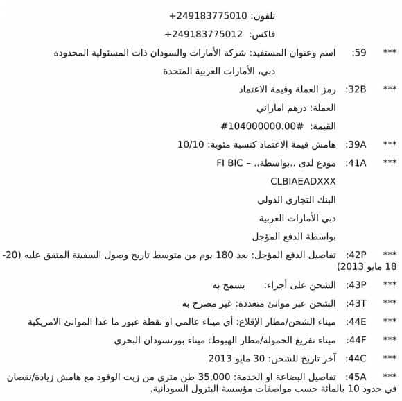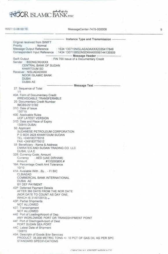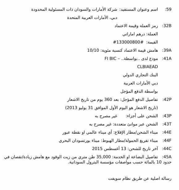وتكتمل حلقة الجريمة بأنهم نفذوا عملية البيع بأوراق مؤقتة و( بعد) ماقبضوا القيمة الكاملة للبيع والتي تفوق 30 مليون دولار خاطبوا المؤسسة السودانية للبترول بعد 15 يوم ليبلغوها بأنهم ليس لديهم الاوراق الأصلية للشحنة!! بل قالوا لهم يمكن أن نعوضكم ونعطيكم أوراقا بديلة وذكروا بالحرف ان لديهم مستند بما معناه بحديثنا الدارج ”اسبير وممكن يمشي الحال!!!“ إذ قالوا نصا ( توفرنا علي مستند ملكية قابل للتسويق، مجاني وخالي من أي إلتزامات أو أعباء ذات صلة بالشحنة. ونحن نملك حقا كاملا وسلطة تحويل مستند الملكية هذا لنقوم بموجبه بتنفيذ شحن المواد لكم.)