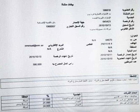 كما هو ظاهر أعلاه، تأسست شركة سد كشركة اماراتية ذات مسؤولية محدودة برأسمال مقداره 300 الف درهم فقط يوم 13 أكتوبر 2010 وبموجب الرخصة رقم 645423 التي مدتها 6 سنوات من تأريخ صدورها يوم 11 اكتوبر 2010 وإنتهت يوم 10 أكتوبر الماضي – (لم يتم تجديدها حتي الآن)! توزعت حصص ملكيتها مابين المواطن الاماراتي عبدالوهاب عبدالله حسن كلباري (51%)، احمد عبدالباقي دفع السيد (25%)، يسن حميده ابراهيم بابكر (24%). حدد سجلها نشاطها وحصره في (تجارة عامة، تجارة مشتقات تكرير النفط خارج الدولة، تجارة النفط الخام خارج الدولة.)