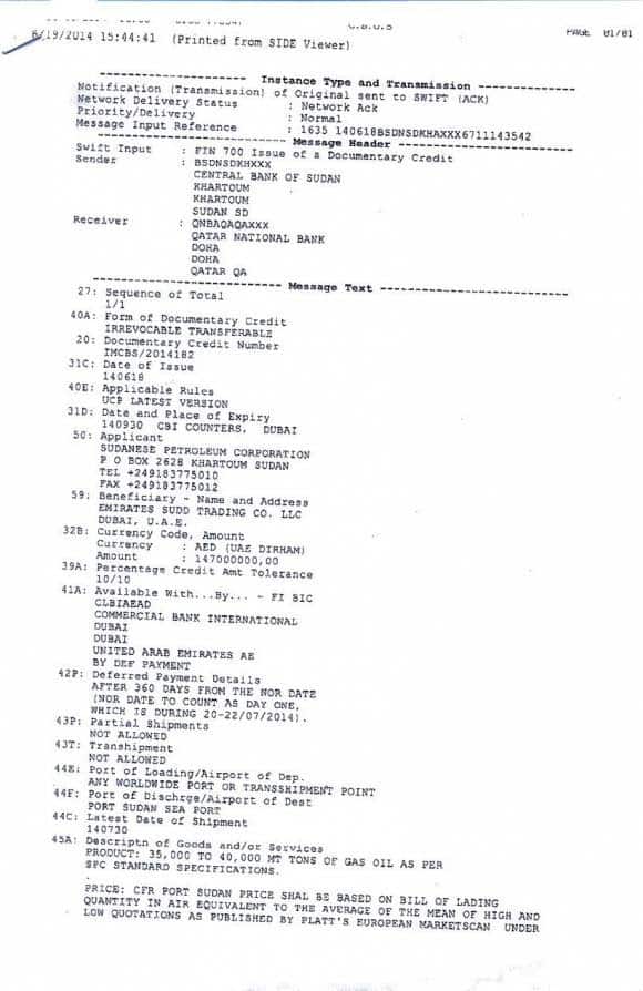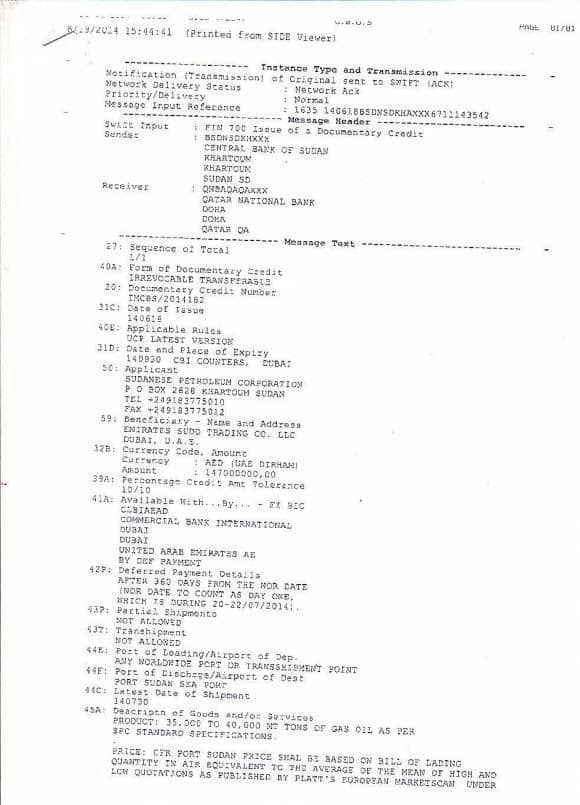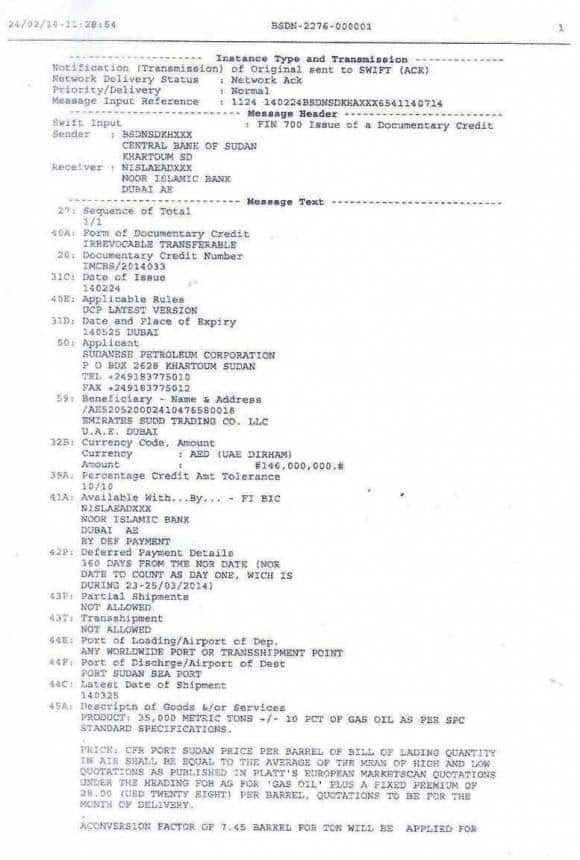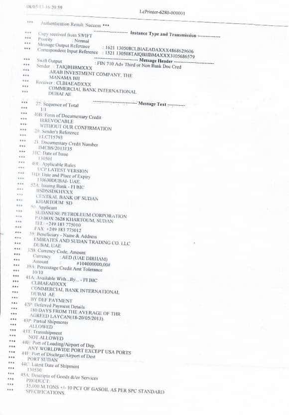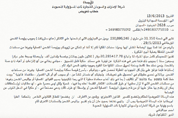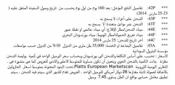 1- أن شركته قامت يوم 29/5/2013 ببيع المؤسسة السودانية للبترول شحنة جازولين كميتها هي 31.350 طن متري وتعادل 230,695,245 برميل