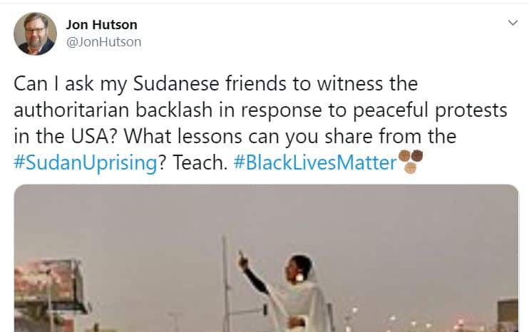 Can I ask my Sudanese friends to witness the authoritarian backlash in response to peaceful protests in the USA? What lessons can you share from the #SudanUprising? Teach. #BlackLivesMatter pic.twitter.com/knu7jnvfS5