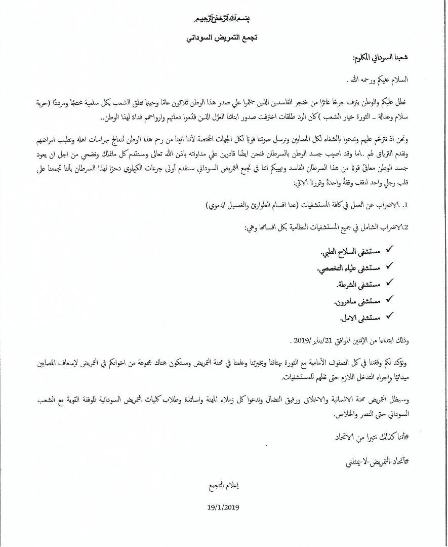 وإننا كذلك نبرأ من الاتحاد المهني التخصصي للتمريض السوداني ومن موقفه المتواطئ مع النظام وبيانه الصادر ضد الإضراب ونؤكد دعمنا لتجمع المهنيين السودانيين ووقفتنا في كل الصفوف الأمامية مع الثورة بهتافنا وبخبرتنا وعلمنا في مهنة التمريض وستكون هناك مجموعة من اخوانكم في التمريض لإسعاف المصابين ميدانيًا وإجراء التدخل اللازم حتى نقلهم للمستشفيات .