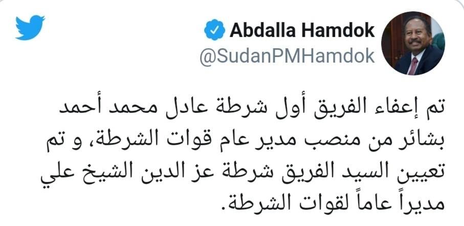 كما أصدر الدكتور عبدالله حمدوك رئيس مجلس الوزراء قراراً اليوم بإعفاء الفريق شرطة عثمان محمد يونس من منصب نائب مدير عام الشرطة.