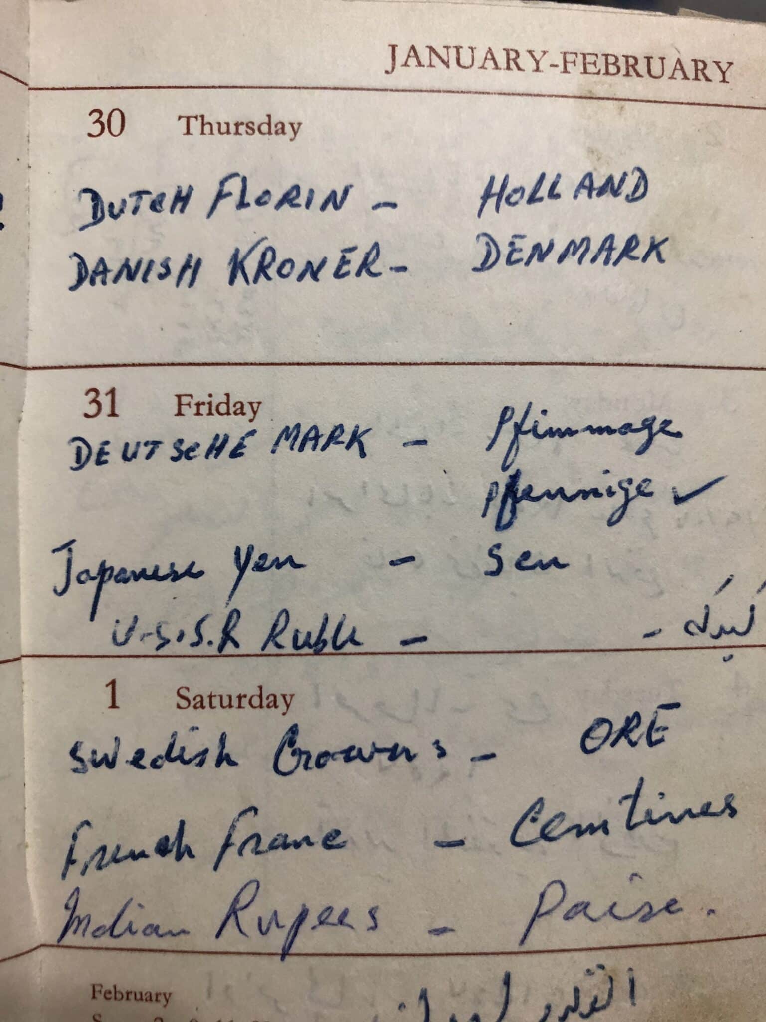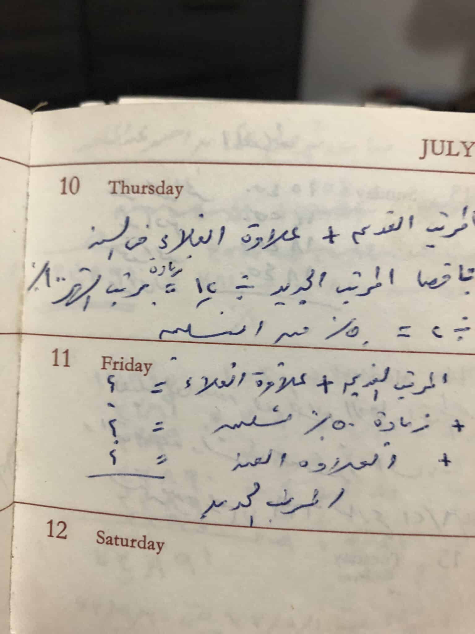هذه المفكرة فيها تاريخه وتاريخ الوطن تاريخه كشخص كادح مناضل شق طريقه كاي شاب سوداني بدأ صرافاً في السكة حديد ومن ثمتدرب وتدرج الي ان صار مفتش مراجعة حسابات السكة حديد، رايت المؤسسية والانضباط في هذه المذكرة المفكرة رأيت تواريخ مراجعةالمرتبات قبل وقت كافي حتي يعطي العامل حقه قبل ان يجف عرقه. حقيقة هذا ما كان يحدث، اول من يصرف من العمال كان السائقين ايسائقي القطارات وال” عطشجية” هل تعرفون من هم العطشجية” ؟ رايت هذا في مفكر الوالد عليه الرحمة. هناك اشياء لم افهمها بلغةالاقتصاد ولكني ساجعلها متاحة لاي شخص يود الاطلاع عليها ربما بها ما يفيد كدراسة او ربما فقط اضاءة لزاوية في تاريخ لا نريد له انيندثر.