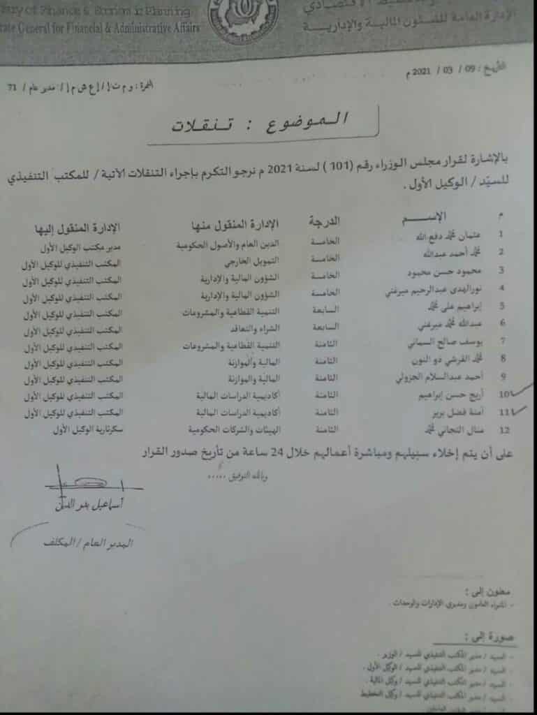 2/ لم يصدق عبد الله إبراهيم الأمر وراح مركِّب ماكينة وكيل أول المالية حتى قبل أن يُصادق إبن خالته د. عبد الله حمدوك على تعيينه وكيلاً أولاً للمالية – العُهدة على مصادرنا النبيلة (لأنَّه متردد ويعلم أنَّ ابن خالته كوز ومخادن للكيزان بل هو ربيب نعمتهم، وفوق ذلك فإنَّ هذا الأمر سيفتح عليه طاقة من الجحيم)، وقام باختيار طاقم مكتبه من الكيزان الذين ذُكِرتْ أسماؤهم في قائمة إزالة التمكين (كما مبيَّن بالخطاب المرفق أدناه)، ومن بينهم شقيق زوجته.