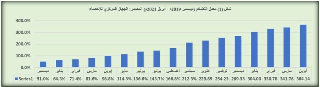 ثالثا: وفيما يتعلق بادِّعاء السيد البدوي وزير المالية السابق كتبرير لرفع الدعم عن السلع وعلي رأسها الوقود بأنه سيوفر 252 مليار جنيه تمثل حوالي 36% من مصروفات الموازنة العامة كان سيتم تغطيتها بالاستدانة من بنك السودان (أي طباعة النقود) مما يساعد علي تخفيض معدلات التضخم. إلا أن الزيادات الجامحة لمعدلات التضخم تنسف هذا الافتراض بكل بساطة. فمعدل التضخم عند إعداد موازنة 2020م في ديسمبر 2019م كان يبلغ 51% وكانت الموازنة تستهدف تخفيض التضخم في عام 2020م إلي مستوي 30% إلا أن معدل التضخم واصل الارتفاع ليصل إلي 98.8% في إبريل 2020م (تاريخ قرار البدوي المفاجئ بزيادة المرتبات) ثم إلي 114.3% في مايو 2020م إلي 136.6% في يونيو وتوالت الزيادات بمتوالية هندسية ليصل إلي 269.33% في ديسمبر 2020م ثم إلي 304% في يناير 2021م إلي 330.78% وهكذا حتي وصل إلي 363.14% في إبريل 2021م علما بأن معدل التضخم المستهدف في موازنة 2021م هو 95%. والبيان رقم (1) أدناه يعكس الصورة المأساوية بشكل أكثر وضوحا للقارئ فالصورة خير برهان. وستتصاعد باستمرار معدلات التضخم لتصل إلى مستويات كارثية كلما تمسكت الحكومة بسياسة الاعتماد علي الحلول الخارجية والخضوع لشروط صندوق النقد والبنك الدوليين.