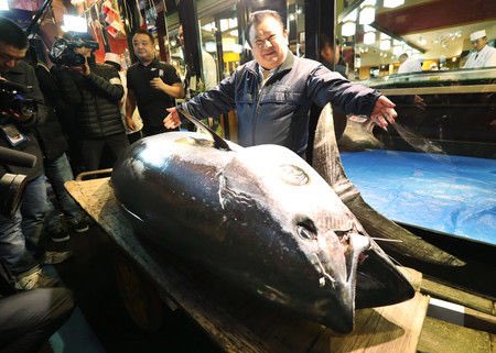 بيعت سمكة تونة بمبلغ قياسي بلغ 333.6 مليون ين ياباني (3.1 مليون دولار أمريكي) اليوم السبت، في أول مزاد يجرى هذا العام بسوق السمك الجديد في طوكيو.