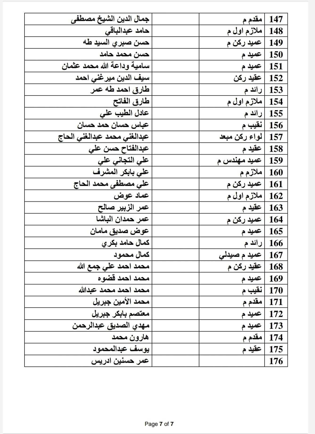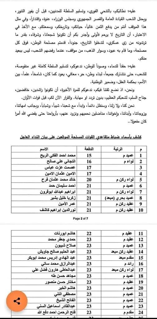 التحية لضباط القوات المسلحة الشرفاء من بالمعاش ومن يعملون بالخدمة نحن نعلم بان لجنة البشير الامنية لاتمثلكم والقرار مختطف الان داخل الجيش لبعض من تتملكهم شهوة السلطة وباذن الله سينتصر الشعب من خلال سندكم له