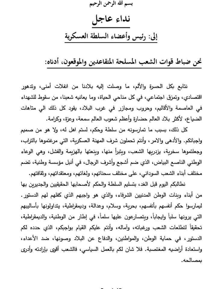 بعث 176 ضابط من متقاعدي القوات المسلحة السودان بنداء عاجل شديد اللهجة للفريق البرهان يطالبونه فيه بتسليم السلطة فوراً للمدنيين، والتفرغ لواجبات القوات المسلحة في حماية البلاد.