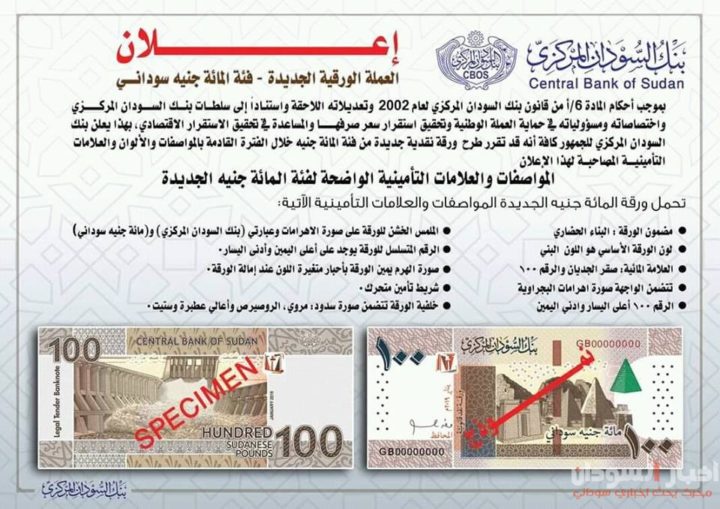 بنك السودان المركزي يكشف عن تصميم فئة الـ (100) جنيه (شاهد الصور)