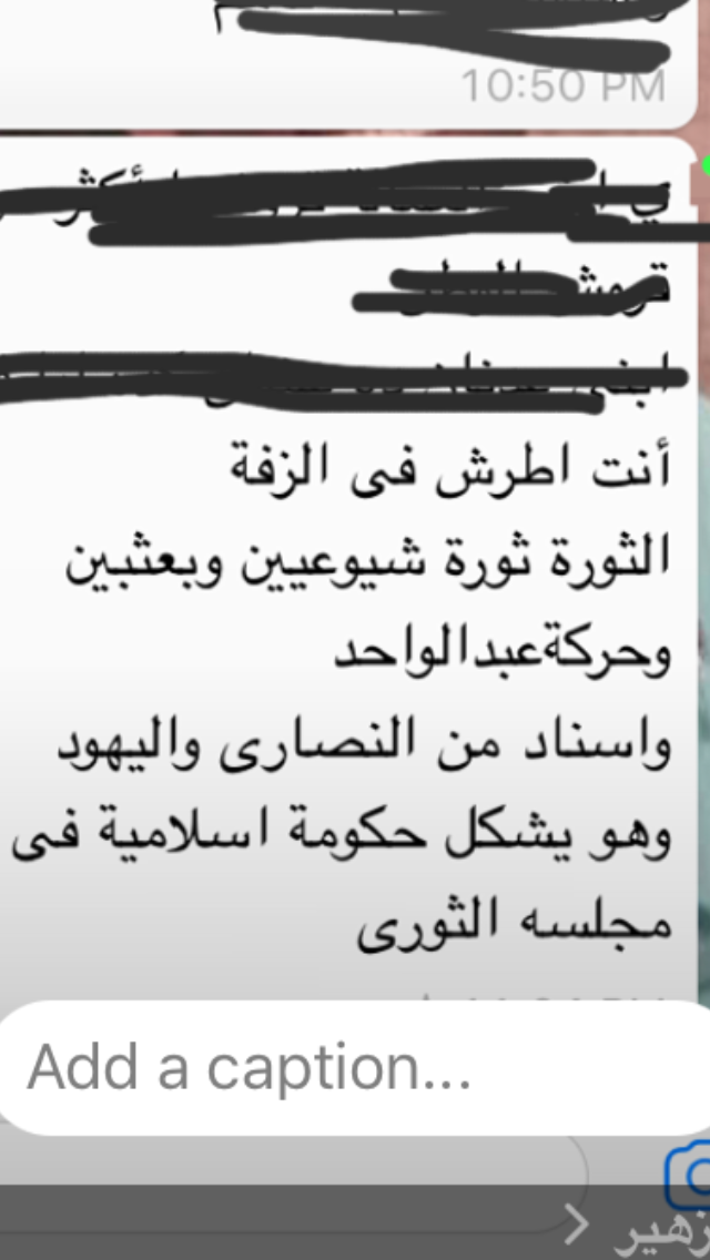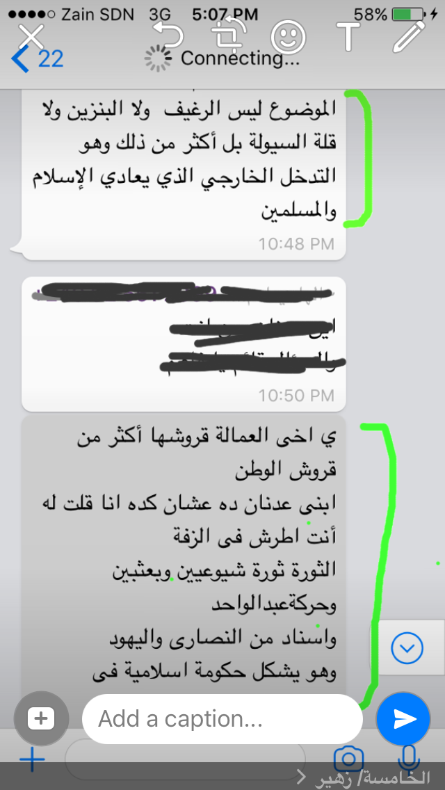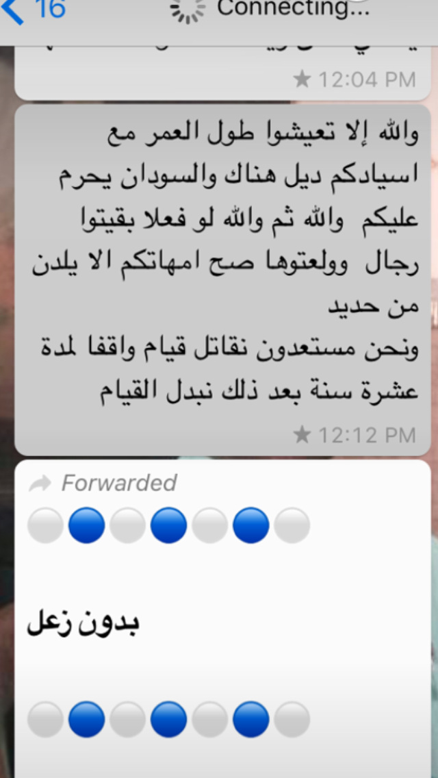 وقال أحده كوادره المستجلبين من ولاية جنوب دارفور في قروب إجتماعي خاص بأبناء المنطقة (والله العظيم حتى الآن في بيوتنا لم ننزل المعركة لأنها لم تبدأ بعد، لكن كل أدوات الدفاع أستلمناها وتم التشكيل ومنتظرين التعليمات). وأضاف أنهم مستعدون للقتال عشرة سنوات. مشيراً في بوست آخر أن ثورة الشعب السوداني المستمرة ضد ظلم وفساد نظام الإنقاذ (أنها ثورة شيوعيين وبعثيين وحركة عبدالواحد، وإسناد من النصاري واليهود). مؤكداً أن أي أمر متعلق بالدولة (لم يقرره الرئيس وحده بل أجهزة الحزب). وذلك ربما يشير – حسب نشطاء – إلى حشد الحركة الإسلامية كوادرها الجهادية لقطع الطريق لتسليم السلطة إلي الجيش في ظل تصاعد المظاهرات المطالبة بتنحي الرئيس ونظامه الفاسد.