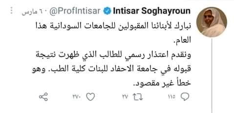 هذه التغريدة مزورة ولا يوجد في حسابها أي إشارة لموضوع هذا الطالب
