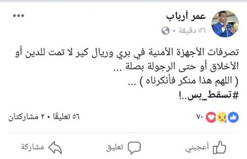وكان المقدم عمر قد كتب قبل أيام في صفحته على موقع فيسبوك: “تصرفات الأجهزة الأمنية في بري وريال كير لا تمت للدين أو الأخلاق أو حتى الرجولة بصلة.. اللهم هذا منكر فأنكرناه”.