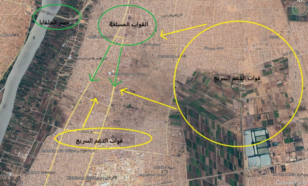 ومن الواضح أن نجاح القوات المسلحة في تثبيت أقدامها في الحلفايا بالرغم من تواجد قوات الدعم السريع في السامراب إلى الشرق والجيلي إلى الشمال وشمبات الأراضي في الجنوب.