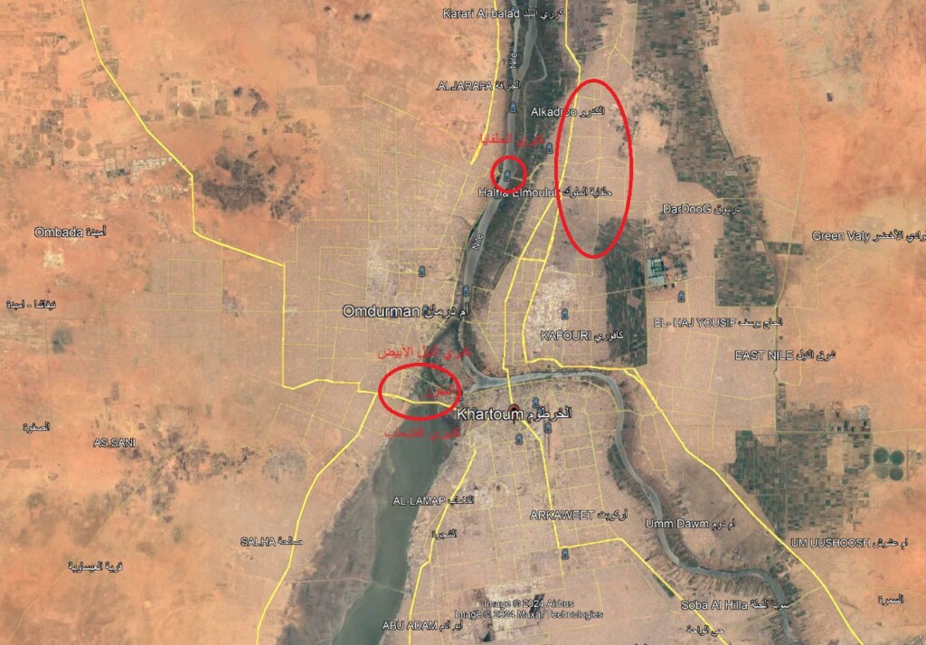 في ذات التوقيت، نجحت القوات المسلحة في عبور كبري النيل الأبيض من امدرمان والتمركز في مدخله من جهة الخرطوم، لكن هذه القوة رغم تمكنها من المحافظة على سيطرتها على مدخل الكبرى، إلا أنها فشلت في التقدم عبر شارع النيل شرقا نحو القصر الجمهوري أو حتى السيطرة بشكل كامل على الأبراج الرئيسية الموجودة في تلك المنطقة. وبشكل متزامن سعت القوات المسلحة إلى عبور جسر الفتيحاب، لكنها اضطرت للتراجع أمام كثافة نيران قوات الدعم السريع المرابطة في منطقة غابة السنط والابراج في منطقة المقرن. واعتبر الخبير العسكري والضابط المتقاعد من القوات المسلحة أن ذلك مرتبط في الأساس بالانتشار الكثيف لقناصة قوات الدعم السريع في المباني والأبراج العالية في منطقة المقرن، كما أن استخدام الطيران في هذه المنطقة المحدودة المساحة سيتسبب في خسائر كبيرة وسط قوات الجيش نفسها التي تحاول التقدم في المنطقة.