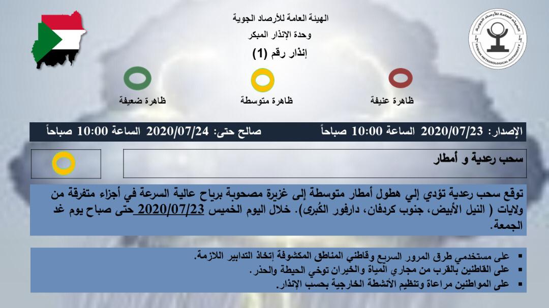 توقّعت وحدة الإنذار المبكر بالهيئة العامة للأرصاد الجوية ، ظهور سحب رعدية تؤدي إلى هطول أمطار متوسطة قد تتحول إلى غزيرة مصحوبة برياح عالية السرعة مثيرة للغبار والأتربة في أجزاء متفرقة من ولايات (النيل الأبيض، جنوب كردفان ودارفور الكبرى) خلال اليوم “الخميس” حتى صبيحة الغد. وحذرت الهيئة، مستخدمي طرق المرور السريع وقاطني المناطق المكشوفة أخذ التدابير اللأزمة ومصابي الأمراض الصدرية والعيون توخِّي الحيطة الحذر.