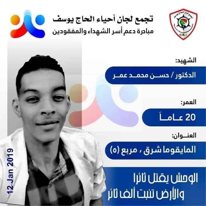 وتمت إصابة الشهيد العمدة “20” عاما من حي المايقوما شرق بالحاج يوسف برصاصة في العنق في موكب 28 ديسمبر 2018، أودت بحياته في 12يناير 2019.
