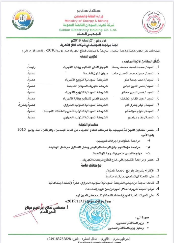 أصدر المدير العام لشركة الكهرباء القابضة مصطفى صالح إبراهيم صالح قرارا بتكوين لجنة لمراجعة التعيين الذي تم في شركات قطاع…